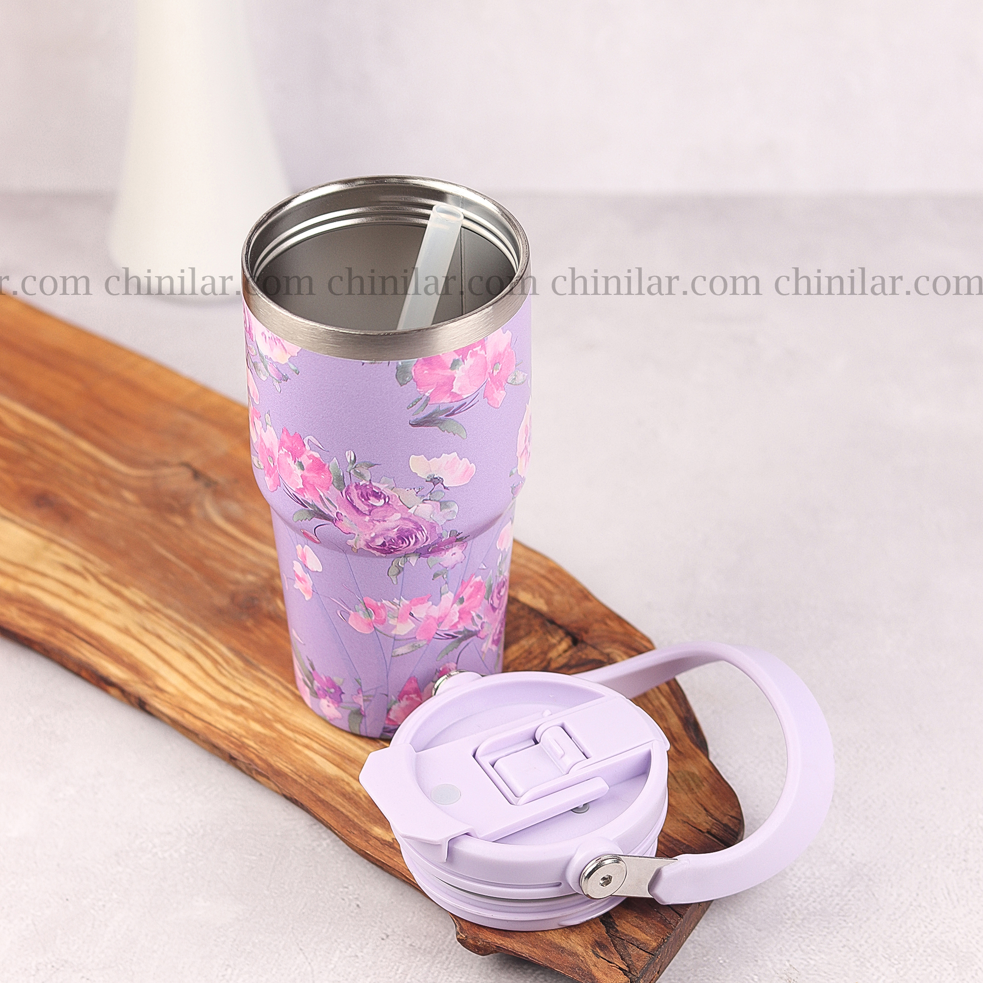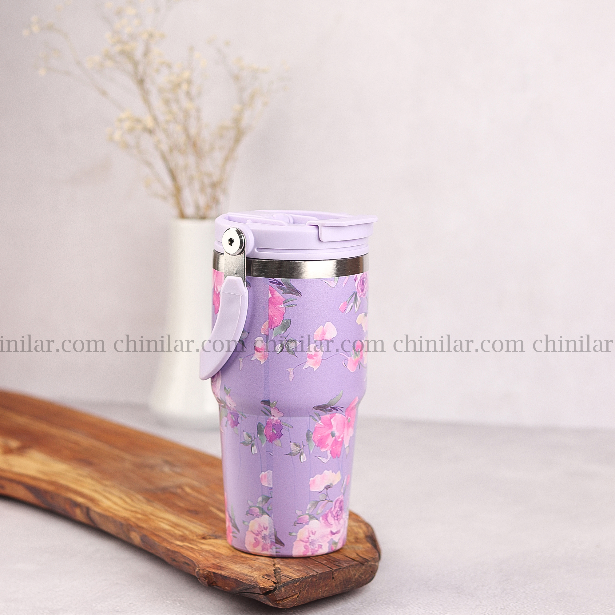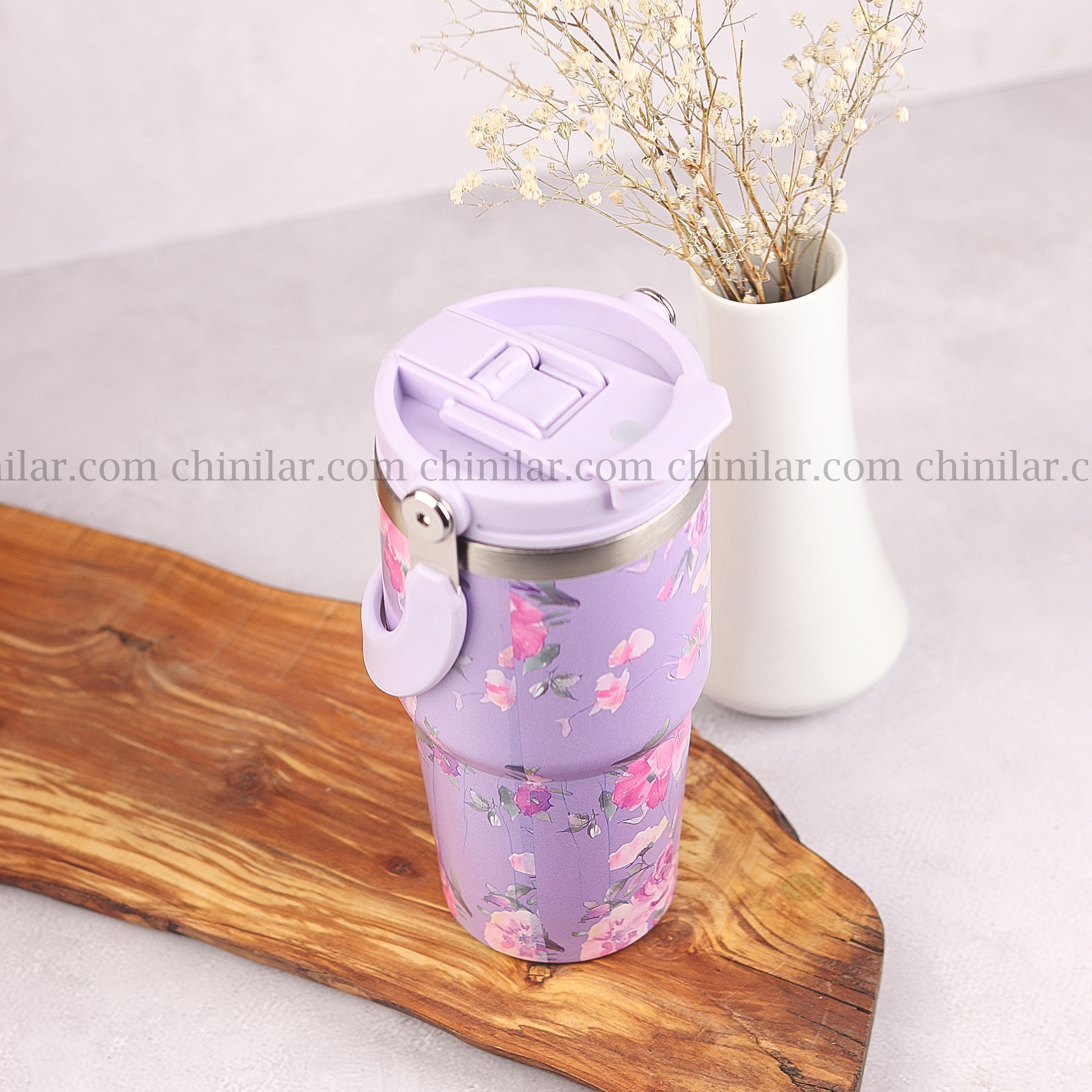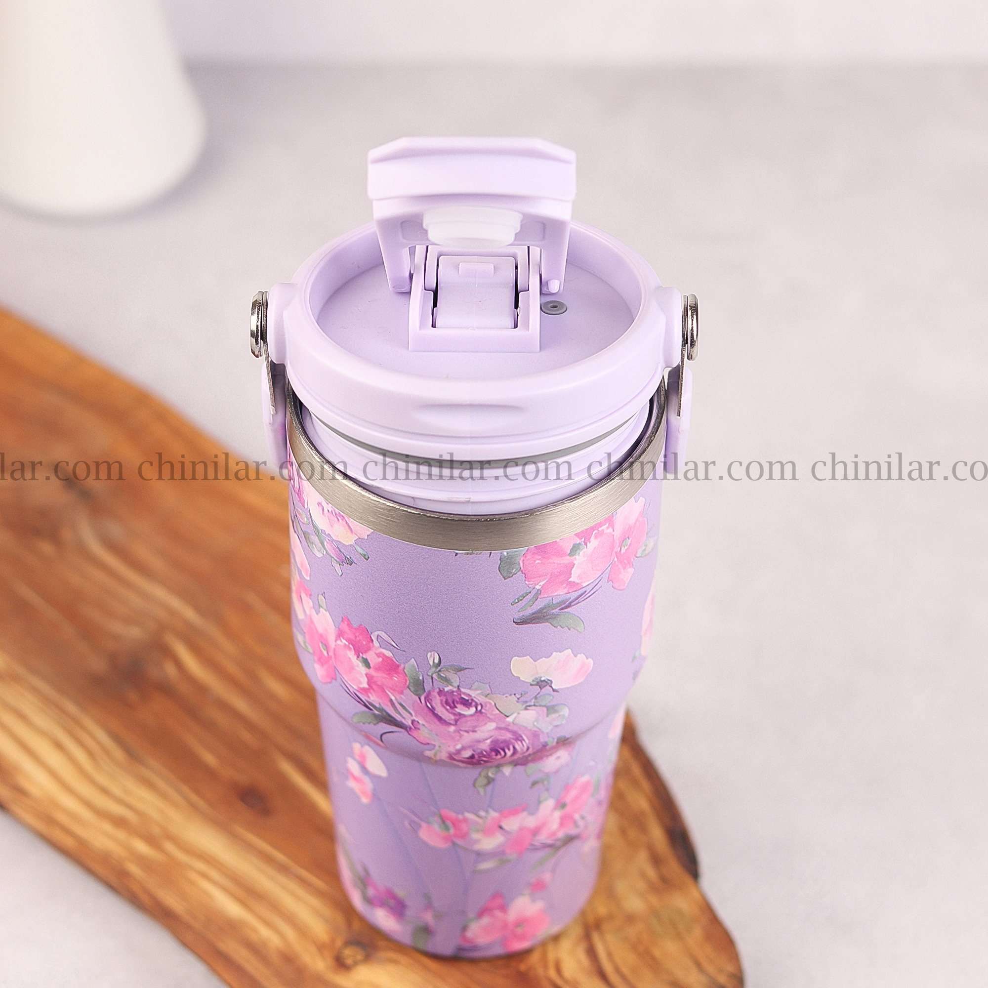 ماگ سفری 600 میلیلیتری AMSZM مدل 5033 – طرح گلگلی با رنگ بنفش و سفید، زیبا، خاص و کاربردی