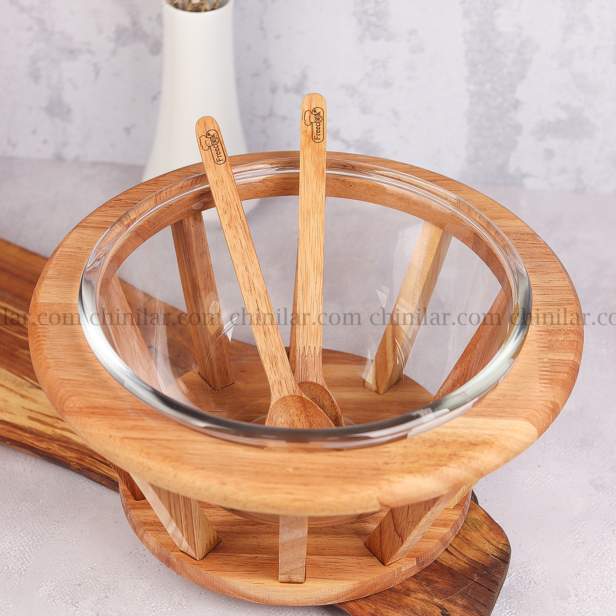 1 عدد کاسه شیشه ای + 1 عدد پایه چوبی + 1 عدد چنگال 1 عدد قاشق چنگال چوبی