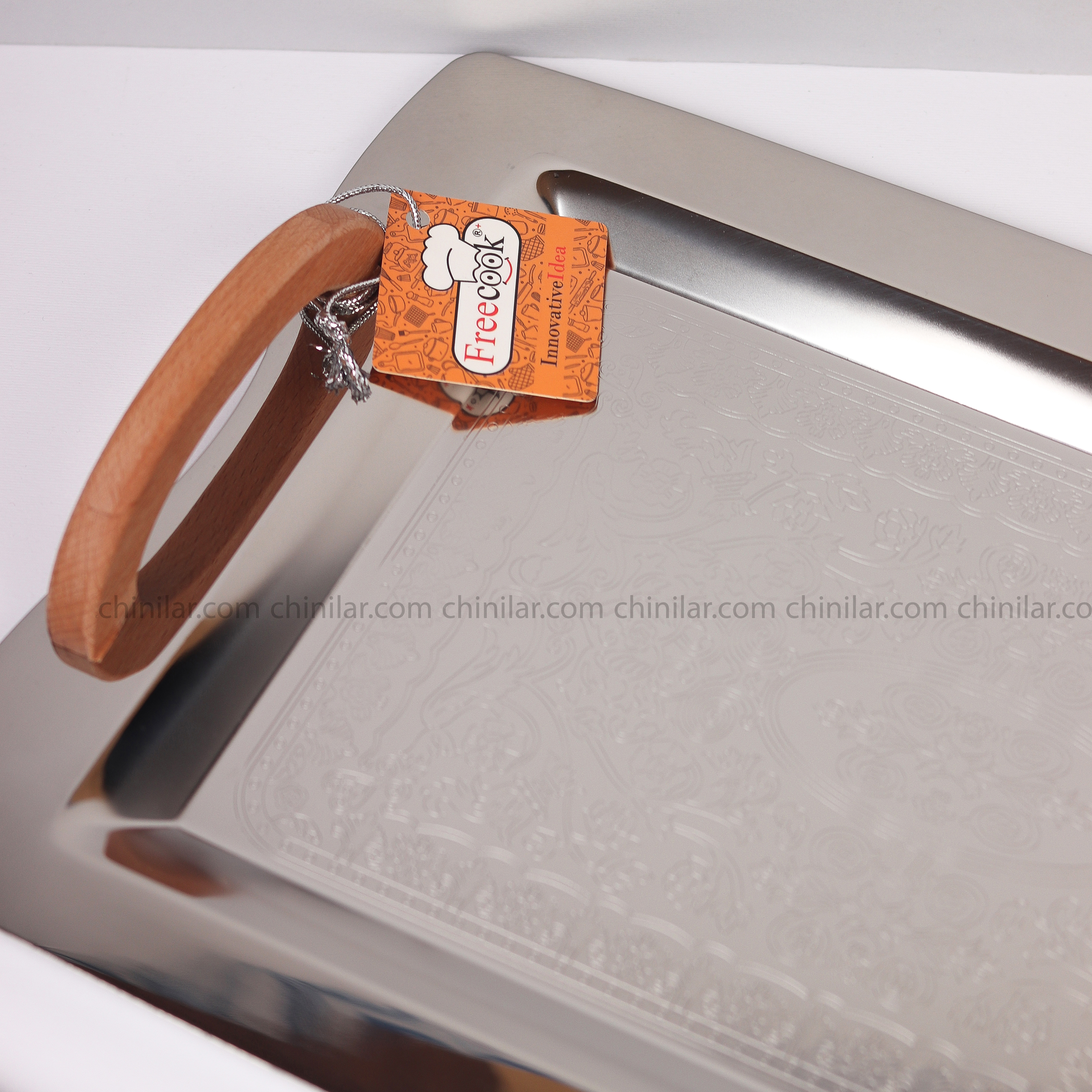 سینی استیل مستطیل فری کوک سایز بزرگ دسته چوبی