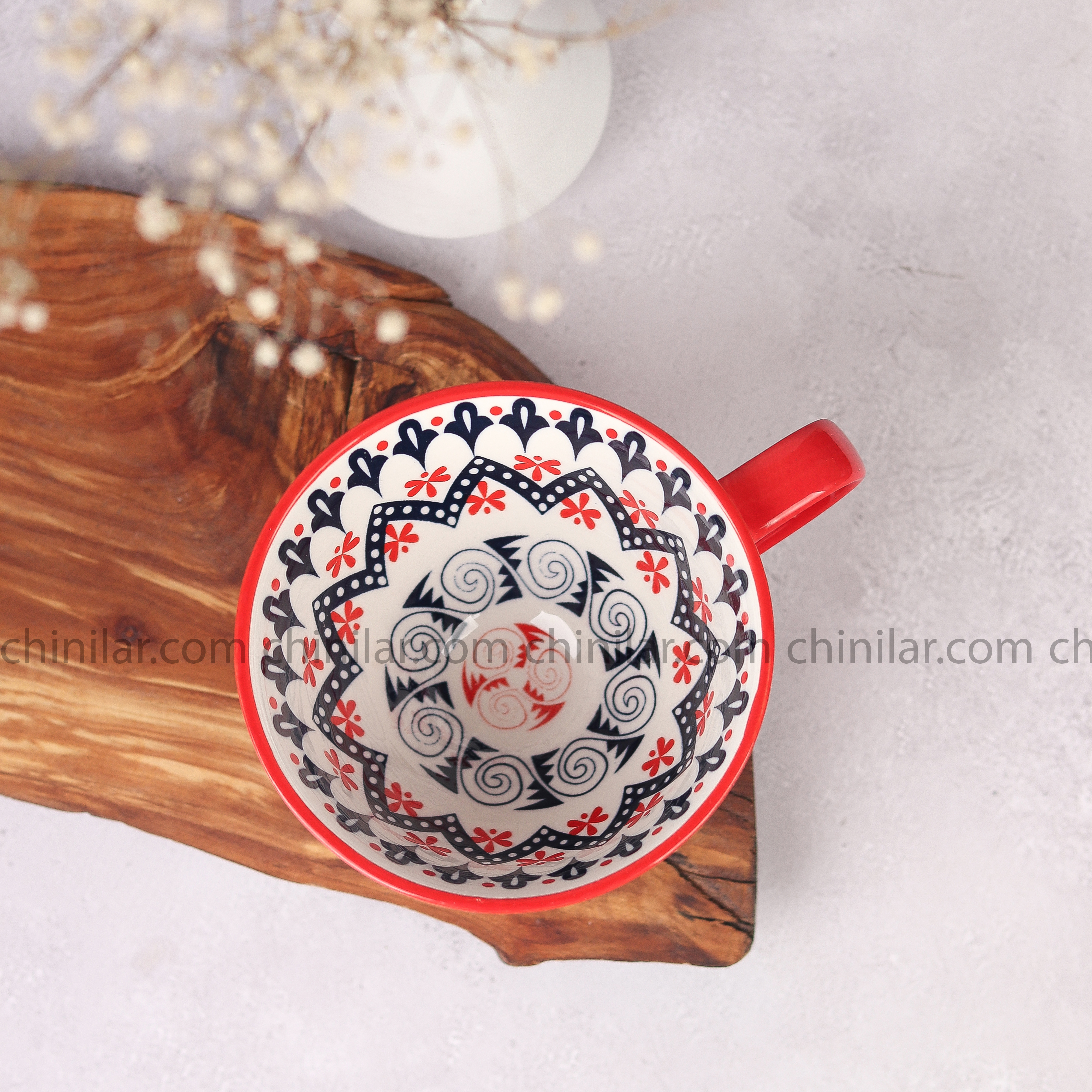 ترکیب رنگ قرمز بدنه با نقشهای قرمز و آبی، ظاهر شاد و جذابی به لیوان میدهد و آن را از مدلهای ساده متمایز میکند. این ویژگی باعث میشود لیوان نهتنها برای مصرف شخصی، بلکه برای هدیه دادن یا تکمیل یک ست قهوهخوری خاص نیز مناسب باشد.