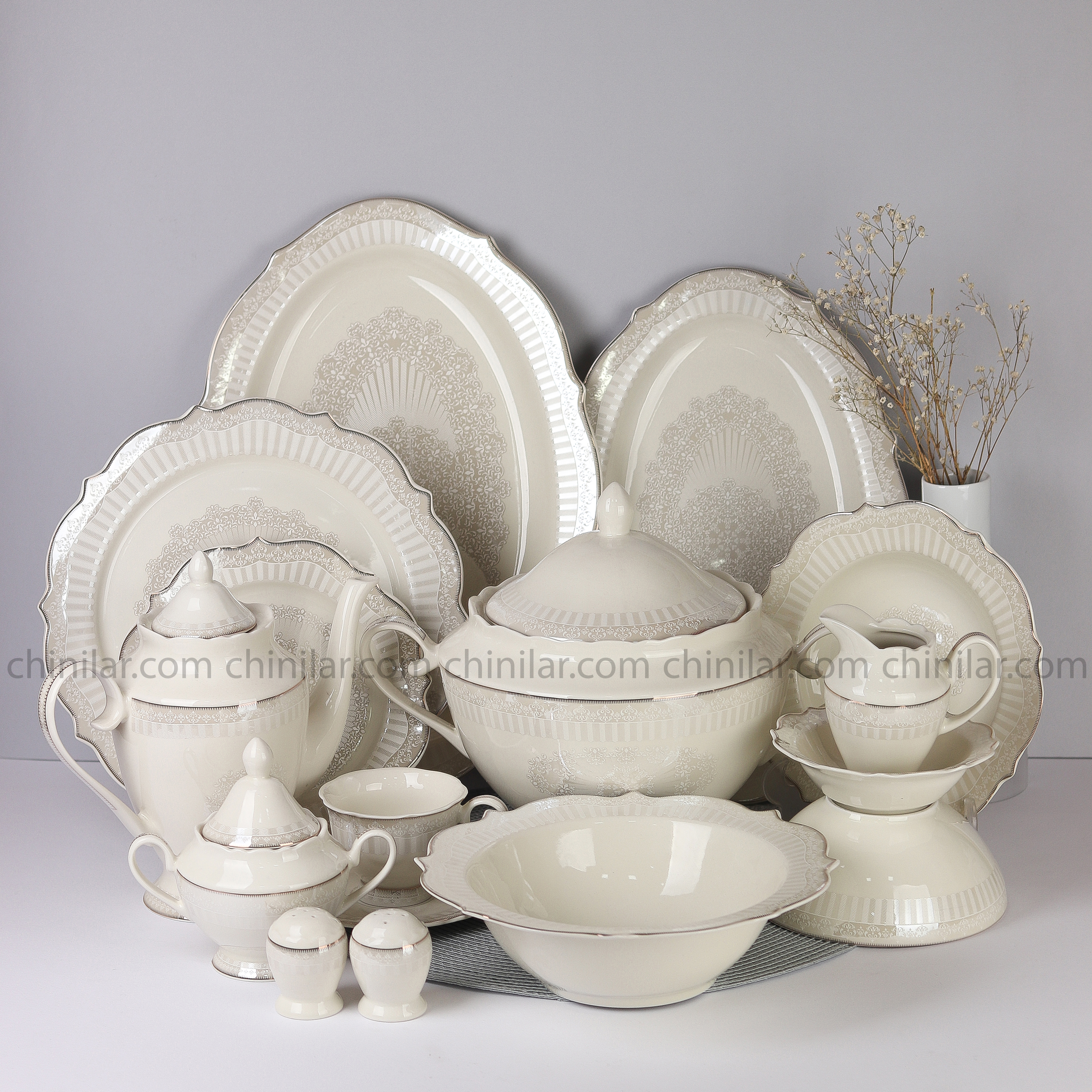رنگ استخوانی با نقوش و دور نقرهای؛ جلوهای لوکس و شیک به میز غذاخوری اضافه میکند